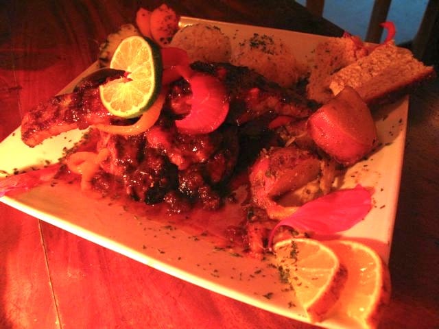 Y Caye Caye Grill: Pork chop, pork ribs, chicken flam grilled and smothered in pineapple cane-sugar BBQ sauce with vegetables, potato and rice.