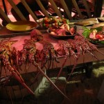 Coconut Sugar-Caned Bombs: shrimp skewered on sugarcane sticks and fire-grilled with floral honey chili glaze. Served on bed of crispy coconut.