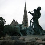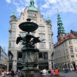 I reached the main center of the eastern side of town after leaving the island Kongens Nytorv. The streets are lined with outdoor cafes and the main canal leading up to the Opera House at the end is decked with ships and expensive yachts. I walked up to the octagonal shaped Palace which has a brilliant equestrian statue in the center. I couldn’t help but laugh as a huge hoard of tourists ran after the 6 marching guardsmen. At the entrance of the Palace is a huge domed Church similar to St. Paul’s in London and on the adjacent side toward the harbor is a famous huge water fountain that looks over the newly built ultra modern Opera house.