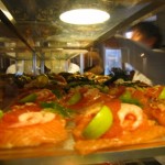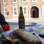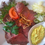 The following two hours would prove to be an inherently heroic adventure! I spent these 120 minutes walking all over town trying to find a decent Smorbrod shop! I found the one listed in my Lonely Planet called Ida Davidson which is the most famous place in town (and the only one I knew of). I almost cried when I walked into the front door like a wet whining dog only to find out that you need to reserve for lunch at least a week in advance! The entire restaurant was packed and the waiter kindly let me walk inside to take a few pictures of the absolutely beautiful open faced sandwiches that this restaurant serves for over 200 Kro a piece (that is about 28 euros for a slice of bread and toppings)! As if a call from God hit my ears, I left the restaurant in the depths of despair thinking I may never actually have the opportunity to eat this national treat. It hit me. Right in front of me was a huge sign that said “M Fine Dining Smorbrod.” Jumping to the facts: the restaurant was amazing and very well priced. The interior is rich red painted walls, black leather seats and white table cloths. I was sitting in one of the swankiest places in the city eating by myself with water dripping from my hair onto my nose. For 101 kro I had TWO delicious open faced sandwiches! My first was Rye bread buttered and topped with two huge pork loins (with the crispiest salted skin fat I have ever had). On the side I had fresh pickled cucumber and red cabbage. The second sandwich was Rye bread with roast beef slices, pickled onion and cucumber, fried onions and remoulade (a Danish Curry). I could not stop smiling. I had worked so hard for this, running through huge puddles, fighting my way through sheets of pouring rain to enjoy this delectable Danish upscale treat! This was a great way to say goodbye to Denmark. I will always relish in my fond memories of the brilliant architecture, cute store fronts and cafes on the canals and my culinary tourism pilgrimage in the wettest conditions. Perseverance has tasty rewards!