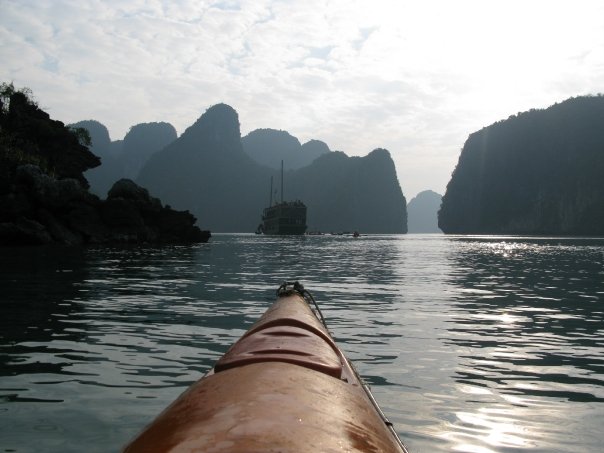 Once at the port there were hundreds of Vietnamese people trying to lure us from our group to join their tour. The docks were teaming with Chinese Junks which was sort of romantic in a diesel engine sort of way. Once on board we sailed through hundreds of beautiful limestone islands and then parked our Junk in a cute little deserted inlet. We then teamed up in pairs and hopped into kayak’s and spent the next two hours paddling through the Halong Bay National Park. My arms felt like noodles and me and my buddy were always trailing at the end of the line. We paddled into caves, under limestone canopies and between tight limestone cliffs. Once back at the Junk I moaned as my arms could barely pull me up the knotted pirate ladder. All of the crazy Aussie’s on board decided to jump off the Junk into frigid cold water. I encouraged the manic behavior so I could get a few good snapshots. I was well humored by the local Vietnamese who take little paddle boats out to the Junk’s to sell tourists cheap alcohol, Oreo’s, Pringle’s and Snickers chocolate bars.