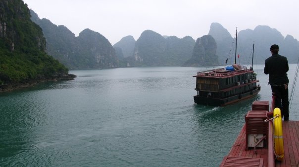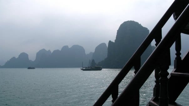 That evening we ate a delicious feast and danced all night on the top deck. The sun set beautifully over the horizon and once pitch black had fallen upon us we could see a few other glowing Junk’s across the bay as the stars started to twinkle above us. I was alarmed at how insanely comfortable and nice our accommodations were. I was expecting to sleep on a disheveled and warped cot but was pleased to hop into a comfy mattress and duvet cover. I fell asleep instantly as the boat rocked back and forth. In the morning I was the first one up and sat on the top deck leaning against a banister watching the morning mist rise over the water and carry the fog over the surrounding limestone silhouette.