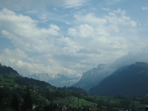 We hopped in Patrick’s car and drove out of the city, onto the highway, through tunnels (in which I jumped at one point as a terrifying Swiss biker gang drove by and screamed at the car in jovial cheer. I thought we were going to be surrounded and butchered) and straight into the Alps. The Swiss Alps are everything you would imagine them to be. I love the spotted tiny communities that span all the way to the smallest clustered peak. The Swiss Chalets are also enjoyable, slanted roofs with planters full of geraniums. On the drive to Interlaken we passed by the towns of Emmentaler and Gruyere (I rolled down the window and yes, I can confirm the air smells of cheese). Once we got right into the Alps, I became used to the constant winding roads (trying to keep my lunch in my stomach) and that’s when it became apparent that everything smells like cow manure. Patrick explained that all of the cows are in the high Alps grazing and the farmers collect their “business” and bring it back down to the valley as fertilizer and aromatic natural potpourri I presume. The vistas are stunning as you drive up the mountains and get a view over the valleys, lakes and small communities that dot the countryside. Arriving in Interlaken we drove around the city and stopped at a nice little spot by the lake where you can look up into the sky and see tons of little bodies flying in the air with their paragliding gear.