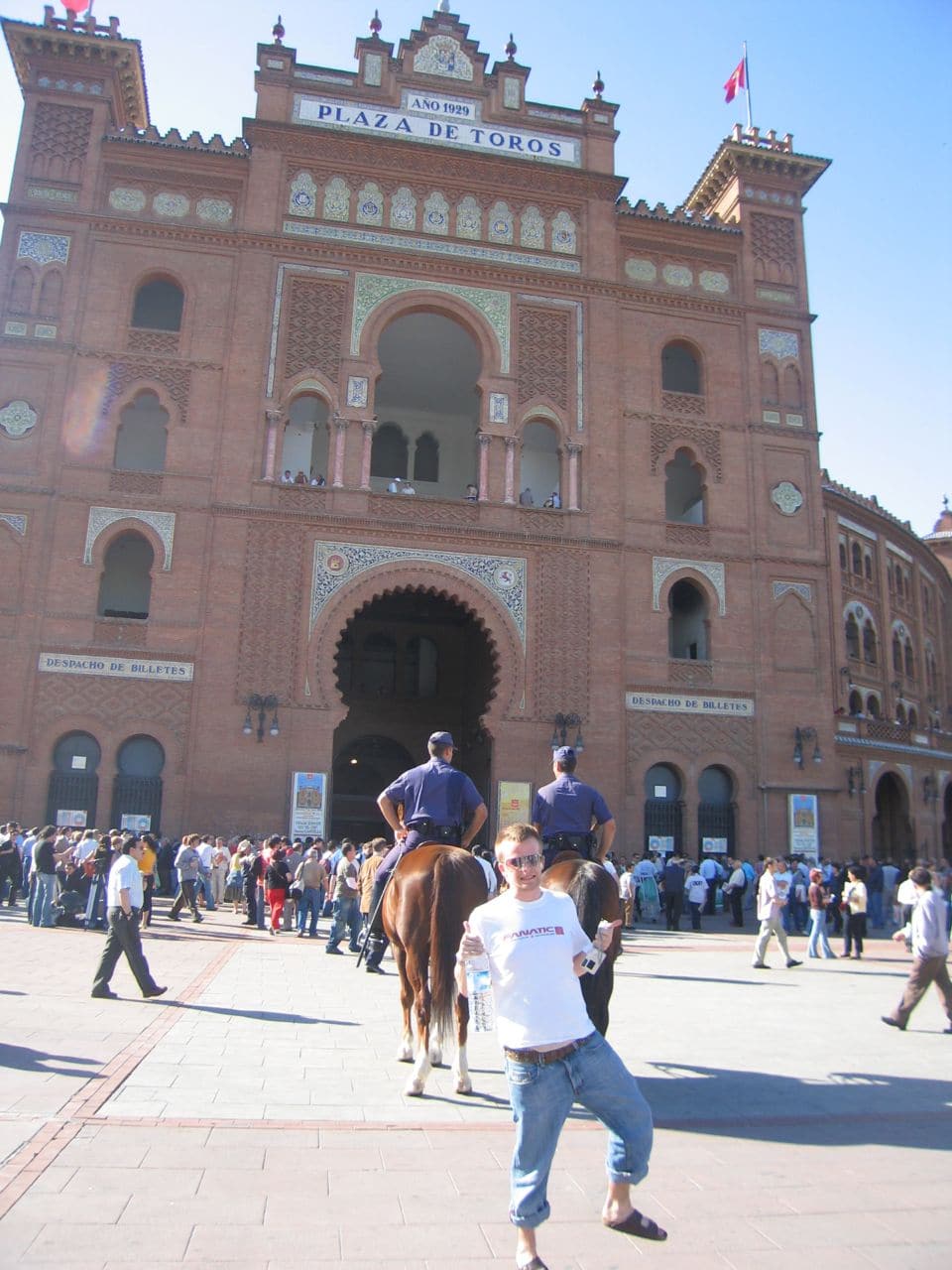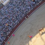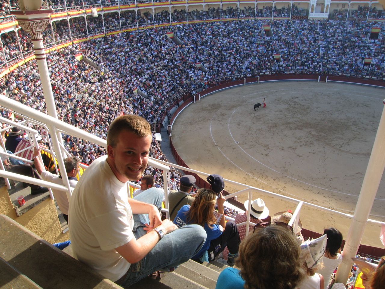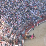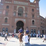 We took the metro from Opera station to Teras and the metro was full of eager bull fighting enthusiasts. As we came up the stairs Helen and I were just shocked: stands full of local vendors selling street meat as well as local sports treat such as roasted nuts, chirros and Spanish candies. The entire place was packed and we ran up to the gargantuan torros building which looked like a coliseum. We had heard tickets can be really hard to find. One of the people in our hostel had gone to get some the day before for the evening and was told they were sold out. It all depends on who the matadors are that evening. It was explained to me that it is the equivalent of coming to see Tom Cruise or Helen Hunt. The Tom Cruise show would apparently have been packed, we saw the Helen Hunt style show. As we stood in line for tickets this wide eyed crazy women came up to us offering us tickets. Helen speaks fluent Spanish as she has lived in Spain for the last two years so she was a great help in getting around for the day. The lady had two tickets for 5 euros each and we thought that sounded reasonable. We had given her the money when a cop grabbed us and freaked out. I was a bit terrified we were going to jail as I didn’t know it was illegal to purchase tickets for the exact same price from someone else. Non the less I played the stupid tourist card and was able to get away from that mess. As we entered the stadium and walked up the stairs my heart was beating like I never thought it would, I was incredibly excited. Sort of like that feeling you get when you are just about to get on a ride at a theme park that you know is going to be fun but also a little terrifying. The entire place smells of cigars and beer, I noticed this as we walked up the three flights of stairs. For 2 euros we got some nice seats at the very, very, very top of the stadium in the sun. People pay more for seats on the shady side of the stadium, up to 100 euros a seat! We sat for about 20 minutes in our designated seats right in the sun and started to feel as thought we were dripping and melting away. Just before the show started I suggested we move over a bit in a shady area as it seemed like the show wasn’t completely sold out. Needless to say we enjoyed the show in the shade much more than we would have in the safari like sun.