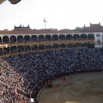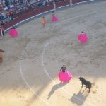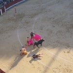 The show started with the now familiar sound of tooting horns and thudding drums. The gates opened and several matadors come out prancing like ballerinas in pink tights and their very fancy outfit and hat. Followed by armed horses and a parade of men who do a lot of waving. They walk the circumference of the stadium and everyone cheers enthusiastically. The bull fight starts rather instantly without any big warning (I expected to have to stand for the Spanish national anthem). The first bull, which was blond in colour, darted out onto the ring right for the matadors. I know realize the show progresses to different levels. Initially several men dressed as matadors entice the bull with their bright pink coloured cape things. The object of the first part of the game is to bring the bull as close to the standing horseman as possible. The horseman is equipped with a huge spear…and once they are able to bring the bull close enough to the horseman, the spear is jabbed into the bulls back. Helen was squeamish the entire time and I felt more pity for the horse who gets lamb basted by the bull and is sitting their unknowingly with a blindfold on and surrounded by heavy armor. The next stage is when the 5 or so matadors take the harpoon like things and taunt the bull to run at them. They quickly jump to the side and jam the decorated harpoons into the back of the bull. Finally the STAR matador comes out and all the others leave. This matador uses a dark red cape rather than bright pink, I assume this gets the bulls attention even more. On a side note of education, I assume that bulls can see ultra violet light similar to bees as red in their spectrum is incredibly bright. So the red cape actually acts as a bright object that the bull wants to chase. The matador now has a long sword and the crowd starts to chant OLAY (not the body wash) as the bull continually chases the cape and fails. The matador reads the bulls movements and behaviors, at this stage the bull is heaving and looks very tired. The matador stands RIGHT in FRONT of the bull with his sword pointed directly at its head. The red cape is waved once more and as the bull approaches with great speed the matador jabs the sword into the bulls back. The bull is now at the end of its rope and is heaving, the final stage of the show the matador tires the bull out until it just slumps over for what looks like a nap. The matador comes right up to the bull with a knife and JABS several times right into its head. This effectively kills the animal no doubt. Believe me the entire experience is surreal. The bull is then dragged away by a horse drawn carriage looking thing and everyone madly cheers. Bull fighting is of dying interest. The entire stadium was packed with locals from the age of 40 to 80. Lots of older Spaniards love this stuff but the young up and coming locals don’t ever go as they are more PETA conscious. They kill a total of 6 matadors at a show. We left after an hour which amounted to two bulls, the Blondie and a big angry black one.