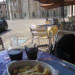 Then the day went downhill, what else is new. I realized after I bought her vinegar I had no cash left. I couldn’t get into the pool as it was 6 euros entrance so I tried to find a cash machine and my heart dropped when the ATM returned my card. Had I run out of money already? I walked all over town and tried three different ATM’s, continually getting the no go signal. I had a bit of panic course through my blood and yet again had another life lesson in how to calm myself down and focus on the good. I thought it a good idea to find a nice lovely shady spot to read. I walked into the Public Park which has a nice little pond full of ducks, big fish and turtles. Entering the park there is a huge sign which made me laugh out loud. It has green circled items such as “do pick up your dogs shit, do not litter etc…” My favorite being “do not sing/opera”. Who prohibits opera singing in a national park? Especially the home town of Poveratti, nuts. I got a bit fidgety and wasn’t in the mood to sit under a tree and read so I followed my hunger cravings and walked all around town trying to find a decent restaurant on a Sunday afternoon. That was a task, a tricky one but I succeeded in finding a nice little spot right on the piazza adjacent to the cathedral. The place is owned by the funniest Italian family. Only one of the family members spoke English and she was a big burly woman, twice my size, reddish brown ringlets of hair with a large silk pink blouse and a voice that could silence an army. I first introduced myself as she was running down the street with a broom chasing a Roma beggar who continually bothers her clientele. She spit on the street and gave me a big smile when she saw me and said AMERICANO! I said CANADA! She ran at me and gave me a big hug. “My uncle, he works in Montreal.” Brilliance, I knew this meal would be excessively good.