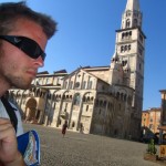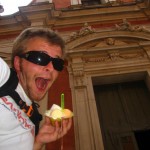 My first course (Primo patti) was the traditional Modenese tortellini (invented 20 minutes down the road in Bologna) with cream and parma ham. My second little dish was out of this world. Talk about fresh ingredients; a plate of roasted garlic, capers, olive oil and roma tomato’s with shaved Fillet Mignon beef topped with parmeggiano shavings and drizzled with top notch Balsamic. I was on the tipsy, and it was about 4pm at this point. I decided to indulge in a bit of home made gelato and walked over to make my selection. I paid for 3 flavors and my new dearest Italian henchwoman insisted I have another for free. I walked down the street back to the hostel passing the neo renaissance cathedral which has two interesting little saints learning out onto the sidewalk. I decided to sit and burned my ass in the process (who knew the sun could really heat up rock staircases enabling someone to fry an egg al fresco?). The gelato melted all down my shirt and face (it was hard to focus with the heat and buzz. Crema, baccio, peach and coconut are a great quatro combination). Sitting in a more appropriate shaded step by the church I stared down at my feet which were sitting right on top of a rocky cobbled street. Who knows how old these rocks are, how ancient is the very spot I am sitting. Weird questions like that raced through my head. As I looked down at my dirty Birkenstock tanned feet I noticed bits of risotto rice, rigatoni and plenty of cigarette butts. As I stood up to survey my surroundings it became evident that the entire street was full of rice and rigatoni! Evidently someone had gotten married recently and I had missed the carb throwing fest! Walking back to my hostel in the dead heat I tried to figure out what the first English phrase Italians are taught in school. Hands down it has to be “I dont speaka de English.”