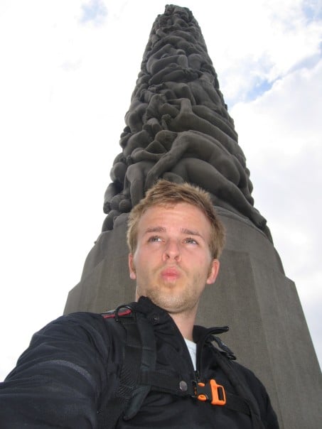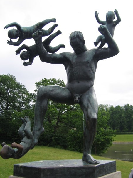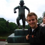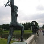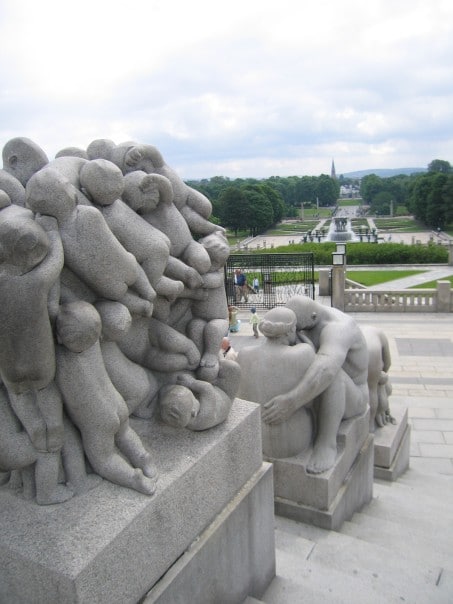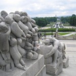 I then walked to the harbor and took a few pictures of all of the yachts and the ferry Colour Line Cruise ship. This ship leaves Oslo and sails to Copenhagen and Stockholm every day (an 18 hour cruise is a long one!). I took the bus to Frogner Parken a huge park located north of the city center. This park is Oslo’s number one attraction and as soon as I arrived I could see why! Within the park is the famous Vigelandsparken. Vigeland was an amazing sculptor who created this park by commission of the Norwegian government. There are over 400 sculptures in the park and each holds the essence of Nordic movement. The statues are bulky, not a Rodin bulky as the bodies are very spherical and accentuate the curves of the body. They are chunky as you would imagine; full bodied women and a Nordic masculine Viking male. A common threaded theme of these sculptures is movement, comedy and the family. Many sculptures show mother or father throwing a child (or baby juggling!) into the air while snapping his or her fingers in a jovial sort of way. Crossing the bridge there are 80 statues to your right and left and once across there is a huge fountain with a basin at the very top and 7 Viking men holding the basin up with the help of boulders. Surrounding the fountain are 48 individual statues with a central theme. All statues consist of a forest of trees and each is different depending on who or what is within the forest (flying babies, dancing women, a sulking skeleton etc…). Walking up the grand steps to the famous totem pole was a gitty pleasure. From the top you can see the entire park and most of the city of Oslo. The totem stretches into the sky and consists of a cluster of 320 intermingled Norwegian people reaching for the sky. I took an incredible amount of pictures as each statue tickled my fancy (Ms. Aunt Susan Dobson, Art teacher extraordinaire I have many picture for you to use next year for your students so you can finally properly explain the Scandinavian art concept!).