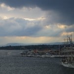 On my walk back to the hostel I realized I needed to use up the last few krones I had in my pocket before I left early tomorrow morning for Sweden. I found an amazing Norwegian Sweater Warehouse that had amazing sales on since it is the summer (and apparently people don’t buy sweaters in the “summer” here even though it is still cold!). I got a nice Norwegian Blue and White Viking wool sweater worth 900 kro for 100 kro! That may just be the deal of the week! All I had left was a little bit of change so I found a cheap bakery and bought a 46 kro sandwich (cheap meaning 7 euro or 11 dollars Canadian!) This was the first food purchase I had made out of a grocery store all week and I devoured it with much zeal. The sandwich consisted of red onion, tomato, cucumber, dill, cream cheese, Norwegian Cured Turkey and spicy mayonnaise. In the afternoon I experienced a true blizzard of rain. It poured down like I have never seen before. As I finished the last few pages of the Da Vinci Code I took a peak out the window and the streets were full of ponds and full blown rivers!