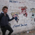 We were given a few nibbles of farmed goat cheese which is made all around the area. We were given two hours to eat lunch so we walked to the main square of town and searched for VISA signs in the windows of the restaurants as we had zero money left (we were leaving for Bolivia that evening). We discovered that only one restaurant in the entire town accepted VISA so it looked as though our decision had been made for us. We walked into La Carreta de don Olegaro just before a rather horrific desert wind and sandstorm came running through the streets. The restaurant was half full of what seemed like a senior’s tour group. We sat directly across from a father son guitar and whistle band. They played many corny songs throughout the meal. The seniors went crazy clapping after each ballad. They were also fiercely critical with anyone in their group who talked during the performanc. A fat couple actually got up and did a little tango to a huge jovial applause. After one of their songs the whistle man stopped and asked people in the restaurant where they were from. We were in the middle of eating and suddenly the spot light was on us. We chirped Canada and burst out laughing when the entire restaurant exploded into a clapping and cheering frenzy. I gave my notorious Queen Elizabeth regal hand wave which was rather unexpected by the crowd (we were sitting on a terrace above them all so it was rather hilarious). We ate an assortment of regional specialties; Popcorn and beef soup, huminita en chala (boiled corn and fondant cheese in corn husk), tamales and beef empanadas.