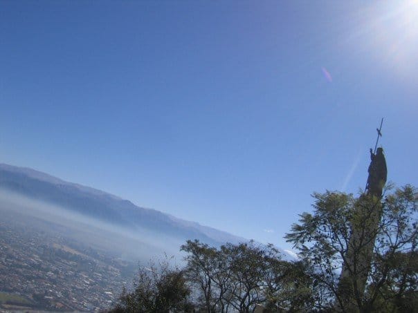 Not until you reach the top of the mountain do you really realize how the city of Salta is surrounded by a huge mountain range. It was our second beautifully hot and sunny day of summer and I actually took my sweater off to tan my white chalky arms. It has been interesting to see how tourists from the USA adapt to South Americans themselves. You can tell when they are just starting their trip when they introduce themselves as Americans. In South America everyone considers themselves Americans as they are members of South America. It is their way of distinguishing themselves from the European nations in which they fought for independence. A well seasoned tourist from the States will never, ever say they are American here as they will just get the same reply, ¨I am an American too!¨ We walked around the park which was a beautiful little stroll several hundred feet above sea level. Gardens abound with white lily’s and little potted plants sitting inside huge ceramic urns. A several tiered waterfall criss crosses itself through these gardens until you arrive at the best vantage point over the city. Directly overlooking the city is a huge statue of Christ surrounded by Palm trees. An odd sight as it looks like Christ is actually standing on the tops of trees. We ate at a restaurant terrace in the clouds overlooking the city bellow with the mountain tops under our noses. I had a veal escalope, empanadas de pollo and a strawberry banana shake.