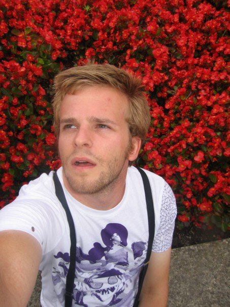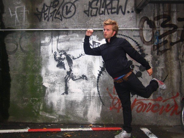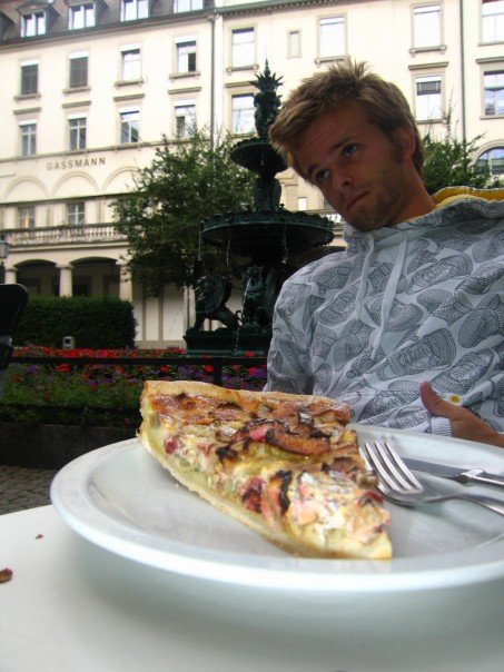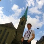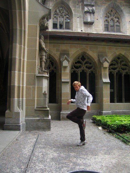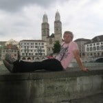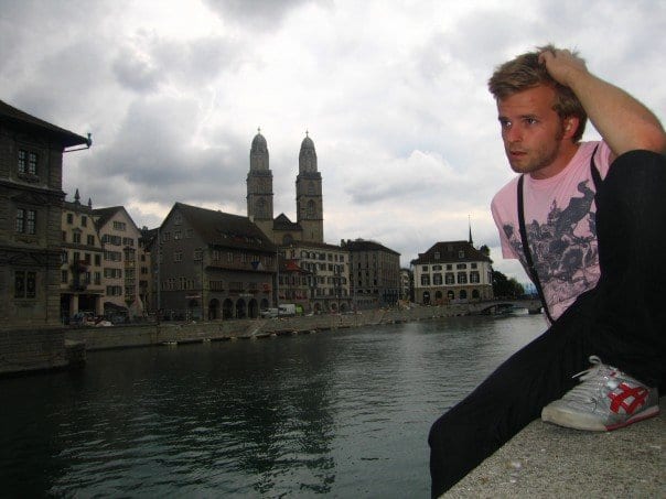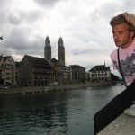 The train to Zurich is a short 45 minute trip. Arriving at the station I grabbed a map of the city and within the first two hours strolling down the main shopping street, Bahnofstrasen, I had purchased an entirely new look and wardrobe. The shopping in Zurich is mind blowingly exciting. I decided to spend the day walking through the sites and taking pictures of myself in my new cloths. Which means, yes, I changed on the street several times, all for vanity and the art of photography. I bought my first pair of black suspenders and changed into my two new graphic t’s on the river boardwalk looking onto the Grossmunster cathedral and Frummunster kirche. I then walked to the very end of the river where the water pours out into the lake. I stopped at a cafe and purchased a traditional slice of Rhubarb custard pie and ran up to the washroom to get into my last outfit. Dark brown five pocket jeans and a graphic 3D shoe white and yellow hoody.