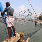 Cochin’s two most famous landmarks are a stones throw from each other. The huge elegant Chinese fishing nets lining the northern shore of Fort Cochin add grace to the waterfront view, and are probably the single most familiar photographic image of Kerala. Traders from the court of Kublai Khan are said to have introduced them to the Malabar region. Known in Malayalam as cheena vala, they can also be seen throughout the backwaters further south. The nets, which are suspended by poles are operated by levers and weights, require at least four men to control them.
